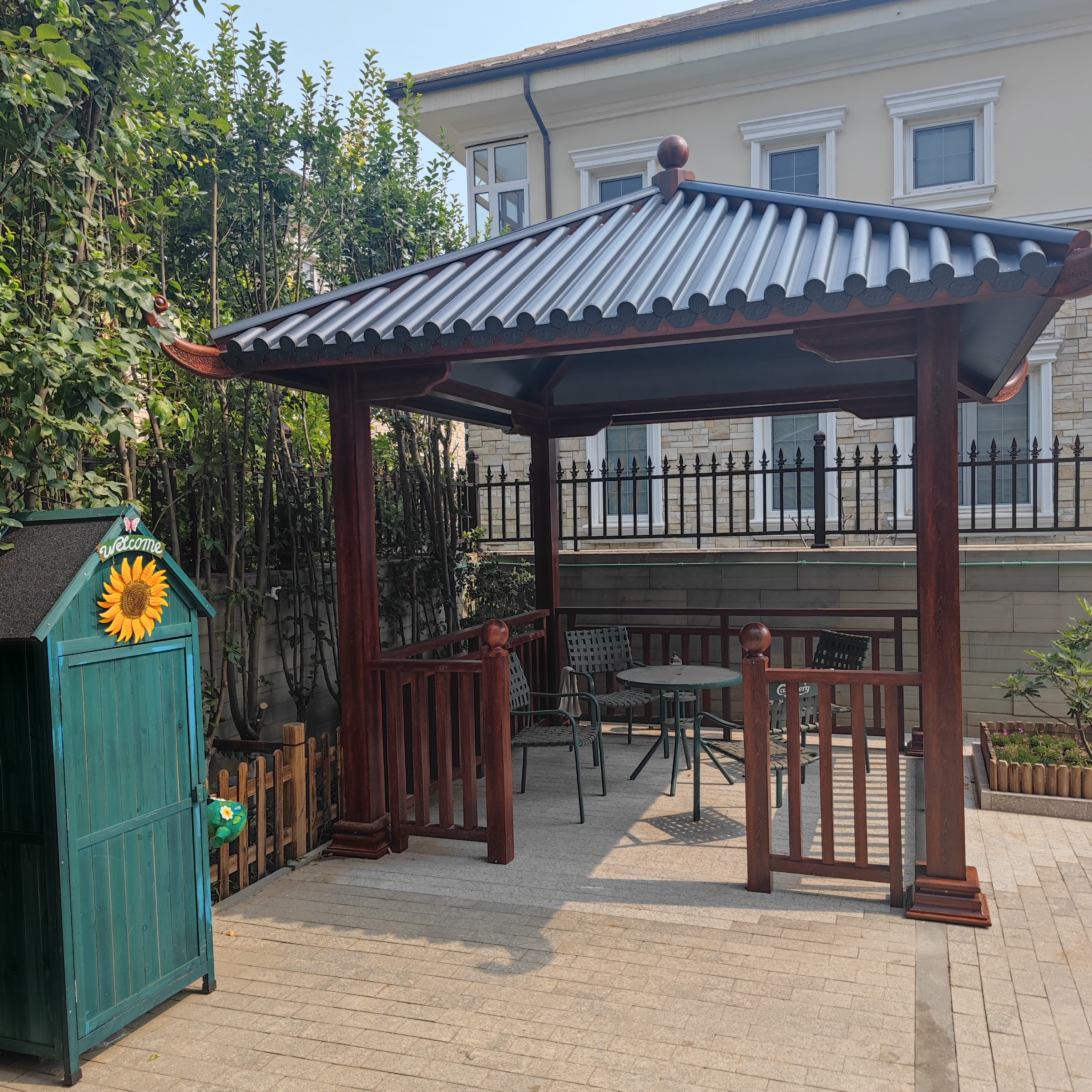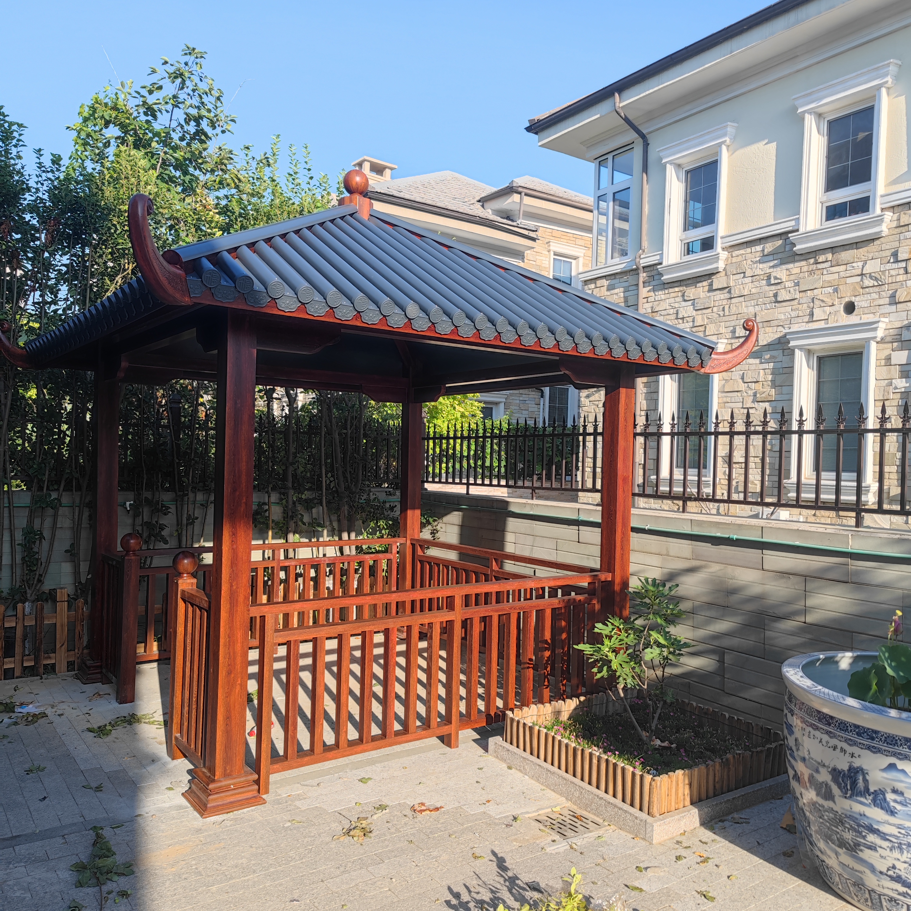 - 新中式风格:四角亭造型,飞檐翘角,深棕色仿木框架搭配深灰 / 银灰色仿瓦屋顶,既保留传统中式韵味,又具备现代耐用性。
